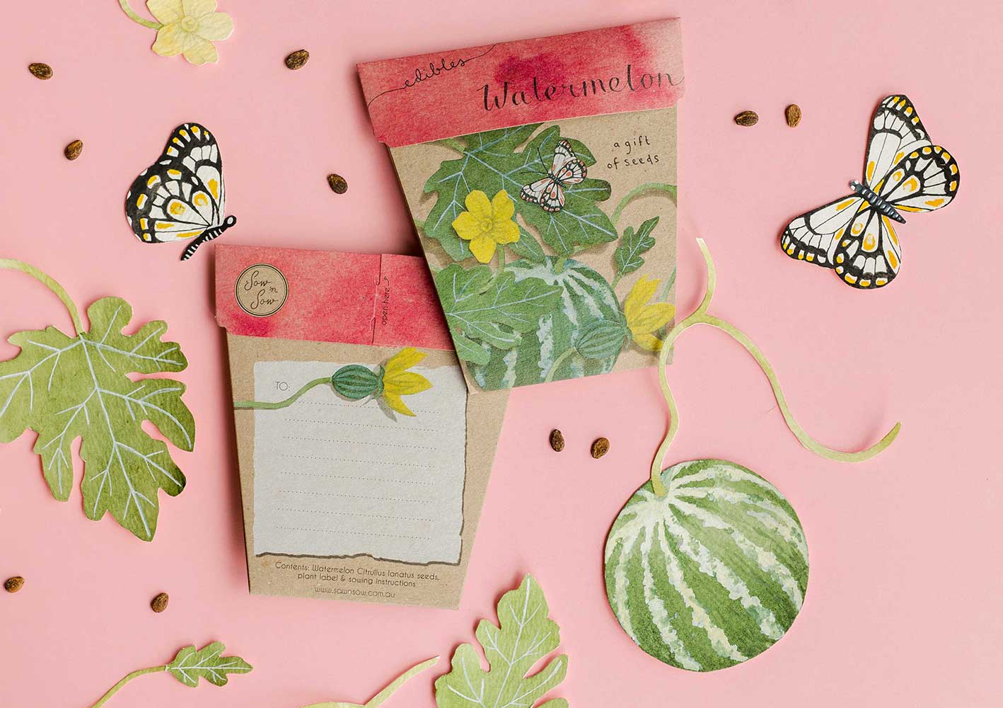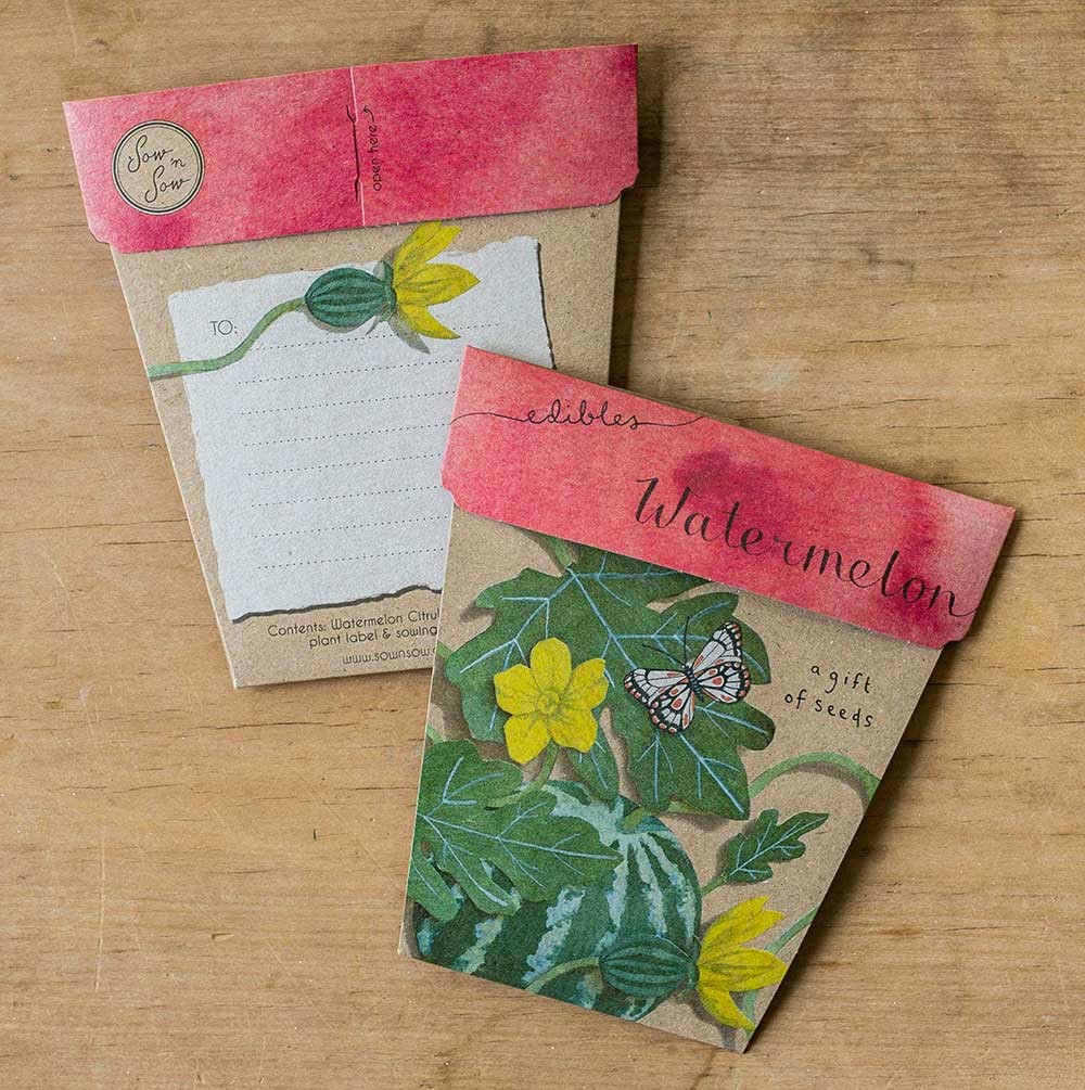 Each card features original artwork by Daniella Germain and includes a packet of Watermelon seeds, a plastic plant label and sowing instructions.
