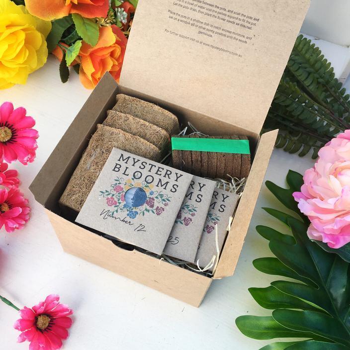 Gift Packs contain 3 seed packets, 3 biodegradable pots (8cm wide), and compressed soil pellets. Packed carefully with wood wool for a natural aesthetic.