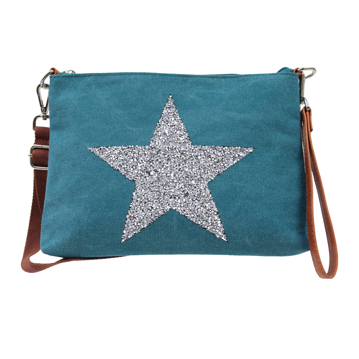External Features: Washed canvas exterior featuring an encrusted star. Back zip pocket. Webbing X Body strap with sliding extender. Removable PU wristlet.