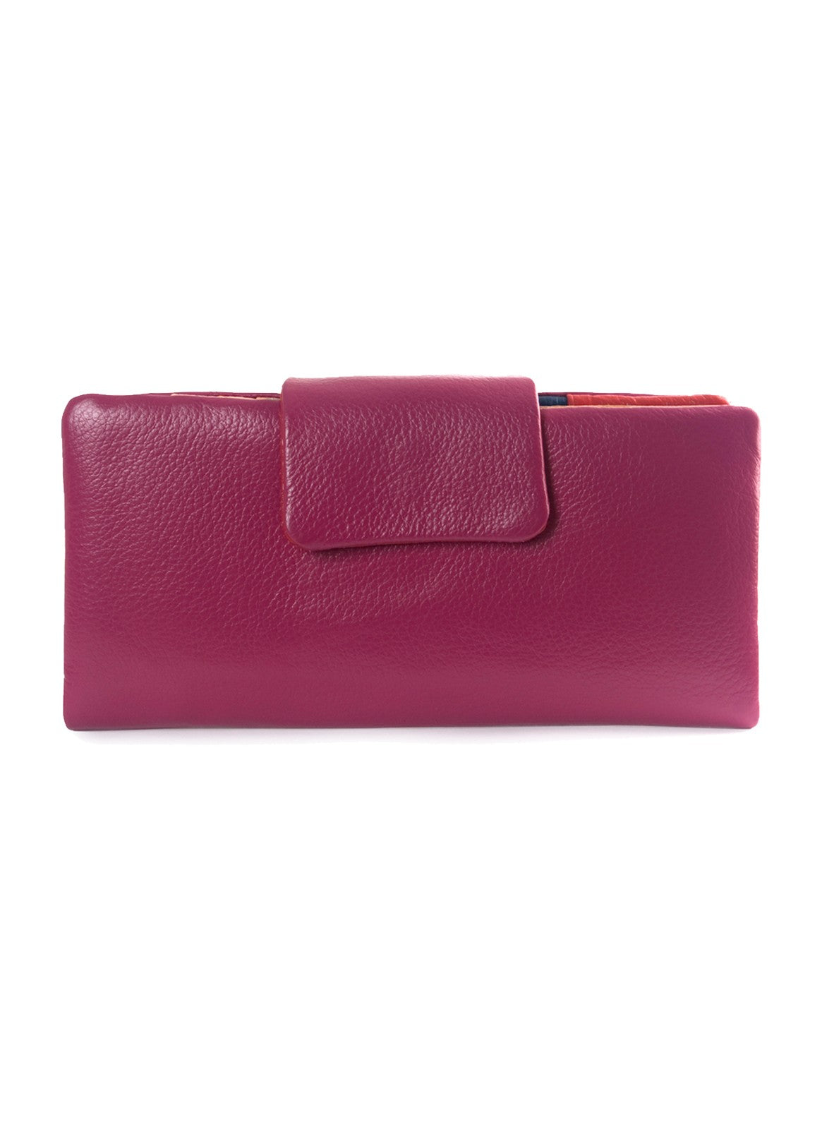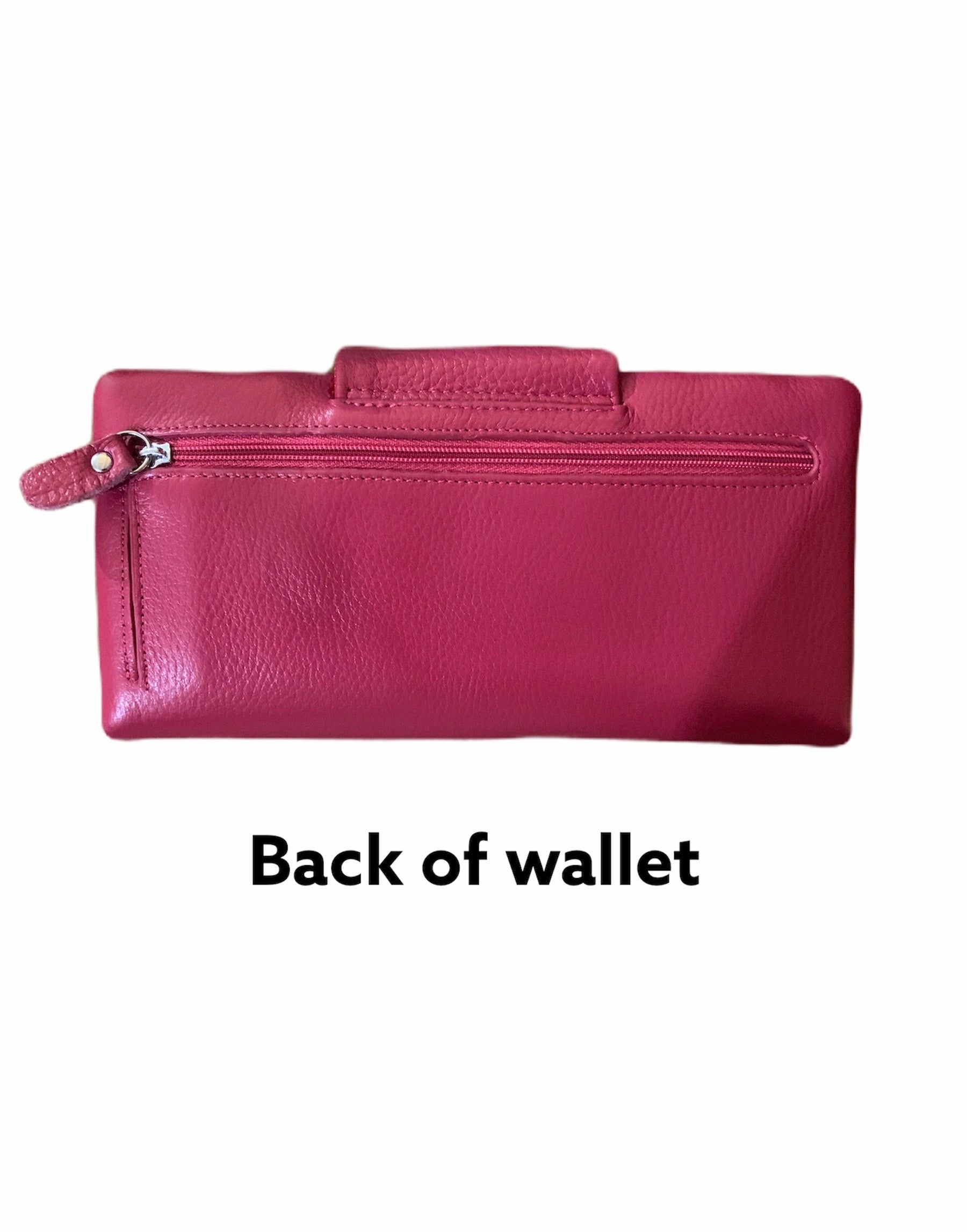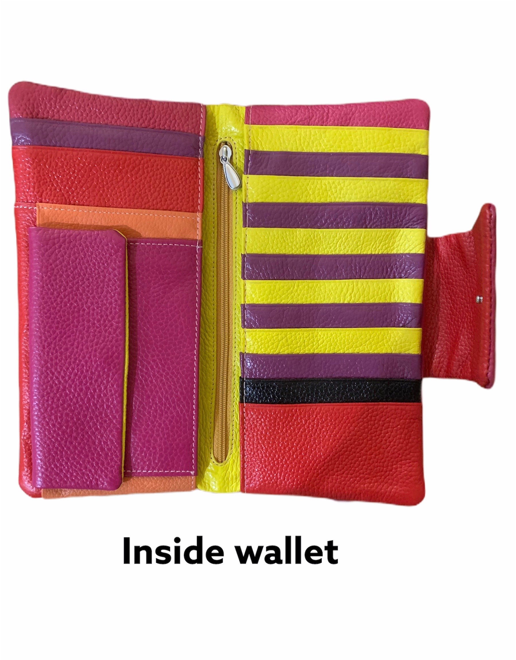 Wallet is made from a genuine leather. A large size leather wallet with a multi coloured interior. A large zip pocket at the back as well. Holds 12 cards on one side. Three on the other side, and a good size pocket. As well a zipper pocket straight down the middle.