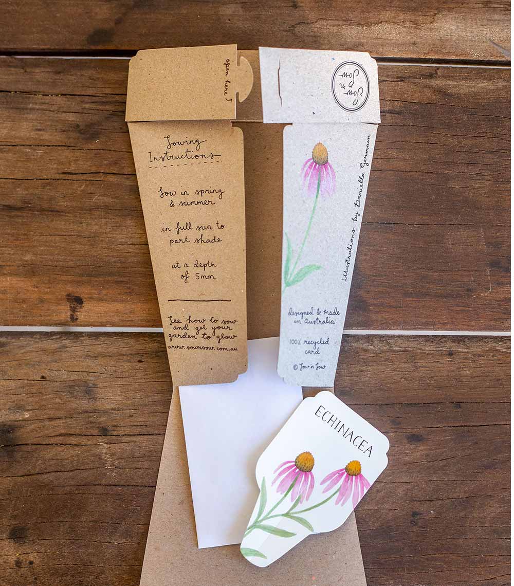 Featuring original artwork by Daniella Germain, the Echinacea Gift of Seeds includes a packet of mixed seeds, a plastic plant label and sowing instructions.