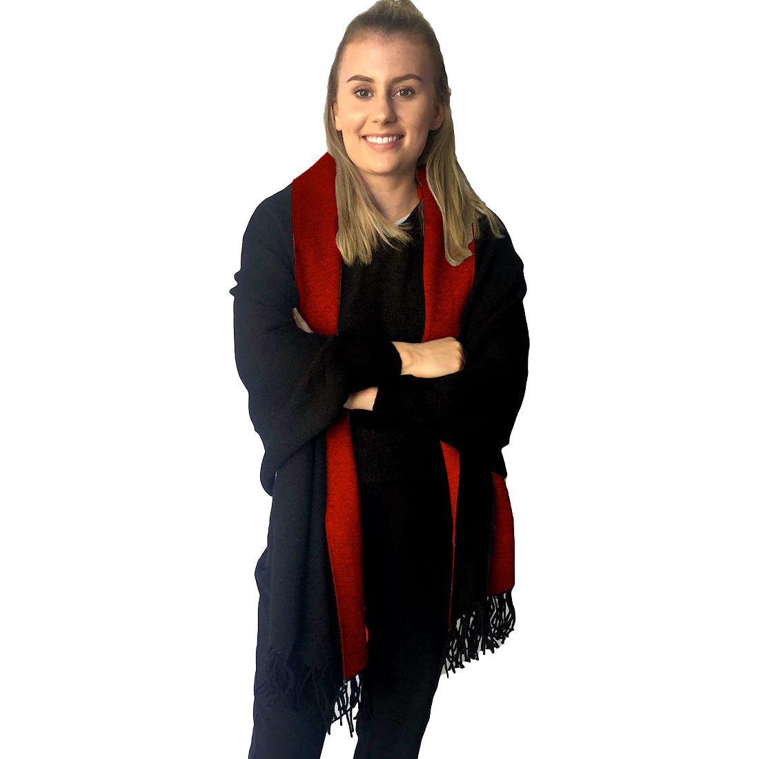To wear the wrap, hold the wrap with the outside colour away from you and with the sleeves at the BOTTOM of the wrap, not the top. Insert your arms into each side of the wrap, adjust the wrap so that the top becomes a collar and turn back so the contrasting colour shows. How far you turn back the collar will determine the length of the wrap at the back.