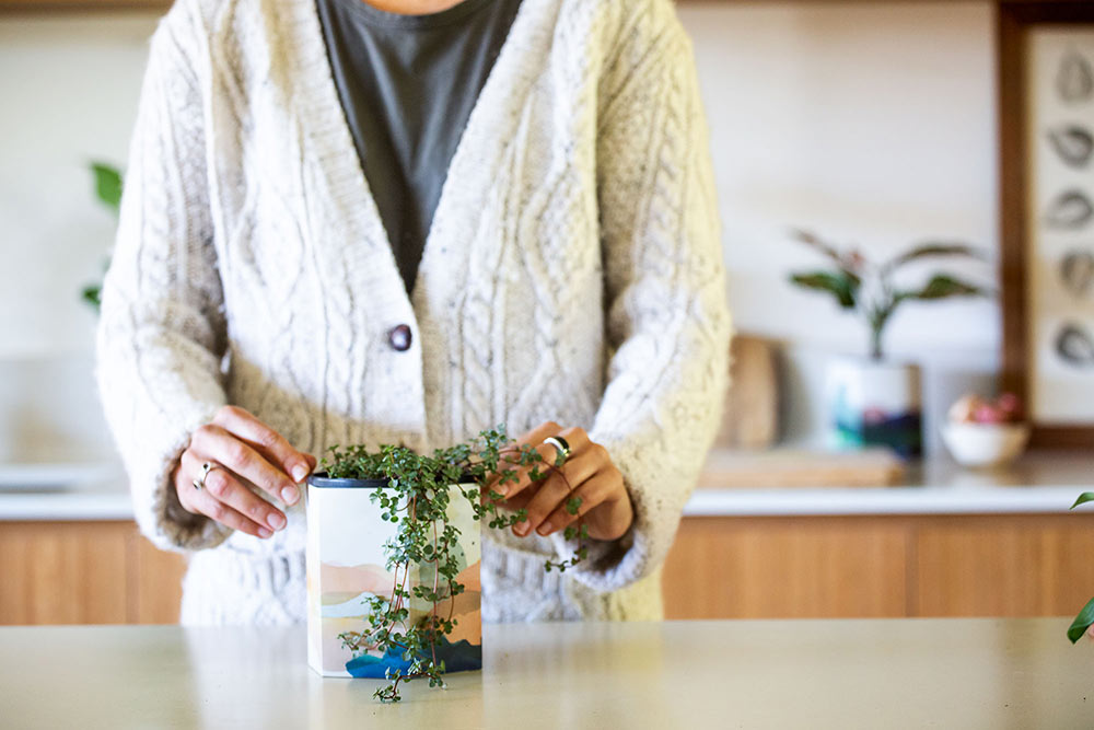 Featuring landscape watercolours by Melbourne artist Daniella Germain, this design is inspired by the Glasshouse Mountains, iconic landmarks of Sow ’n Sow’s Maleny-based operations.