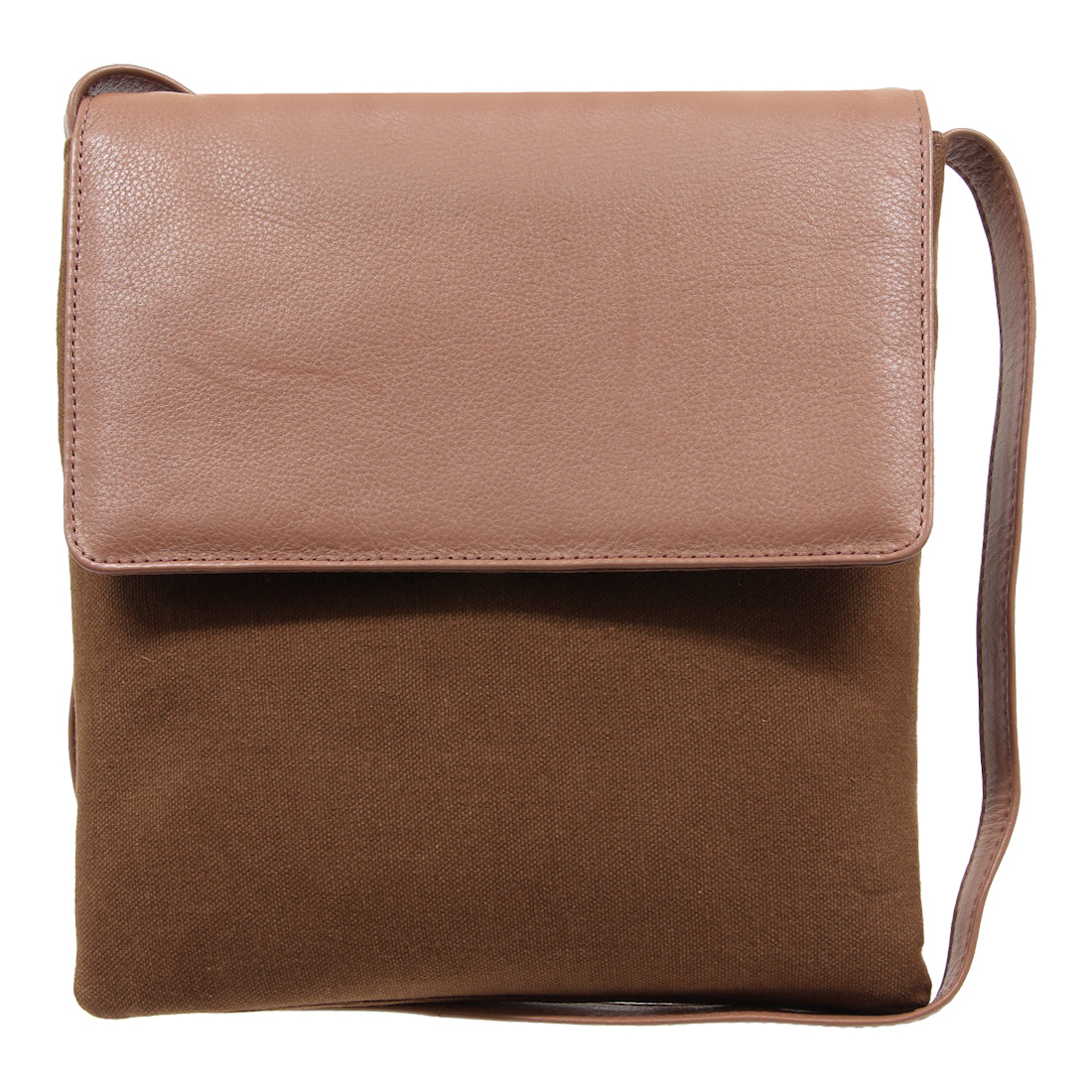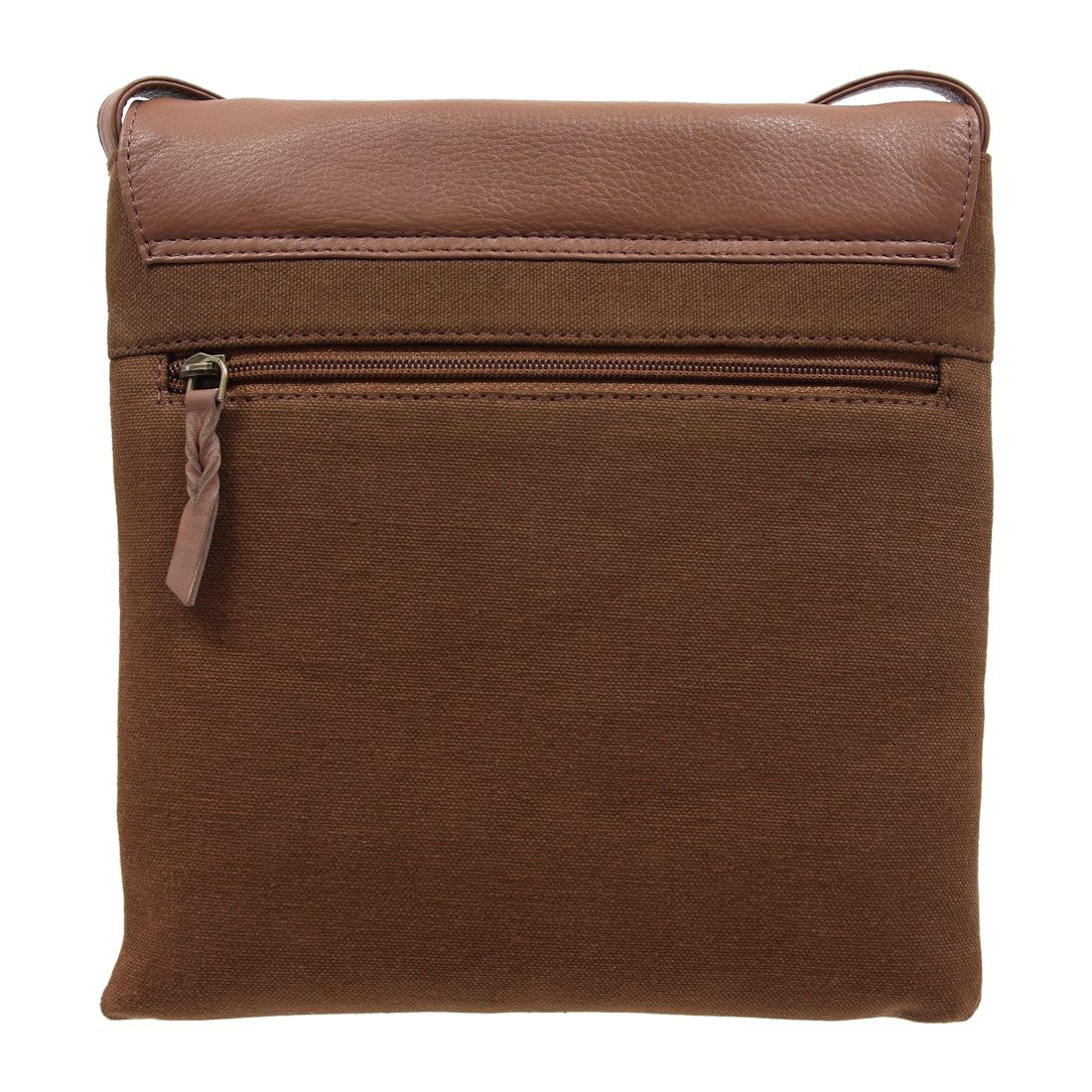 External Features: Strong canvas base with supple leather flap with mag snap. Outside zip pocket and zip closure under flap.