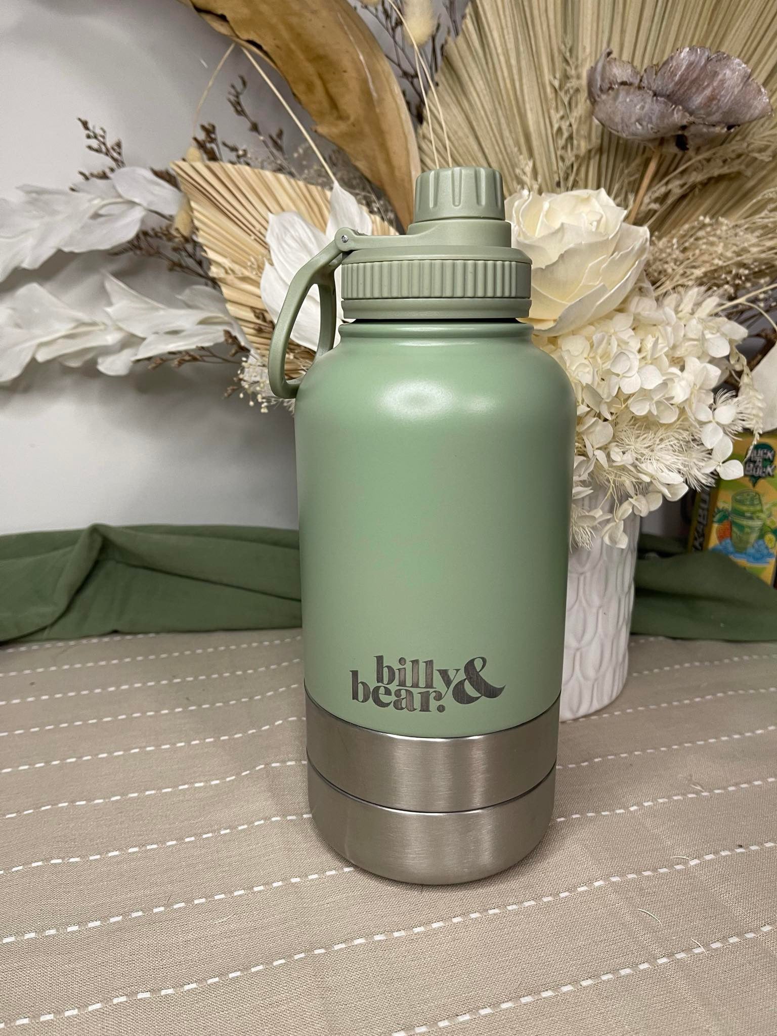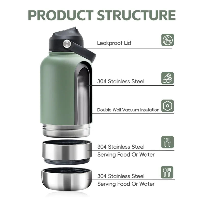 This 32oz stainless steel bottle comes with a secure lid and food and water feeding bowls. Providing a convenient and durable solution for all your hydration needs. Made from high-quality stainless steel, this bottle ensures long-lasting use and is the perfect choice for active individuals seeking a reliable water bottle.